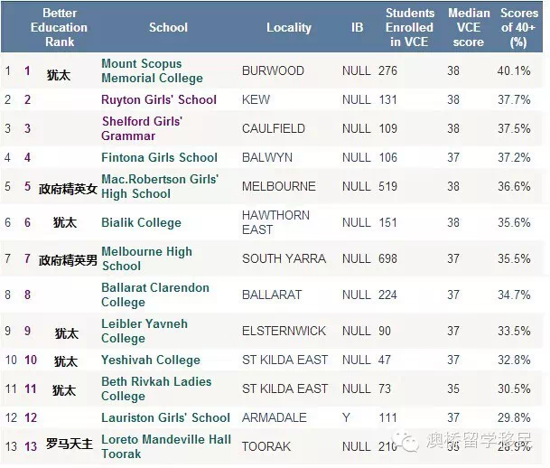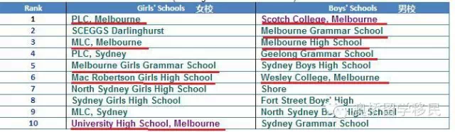 纵观历年的VCE考试成绩(类似澳洲高考),除了政府精英中学Melbourne High和Mac Robertson之外,前30位的学校均为私立中学。