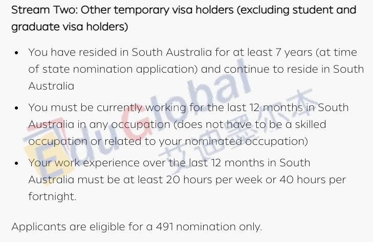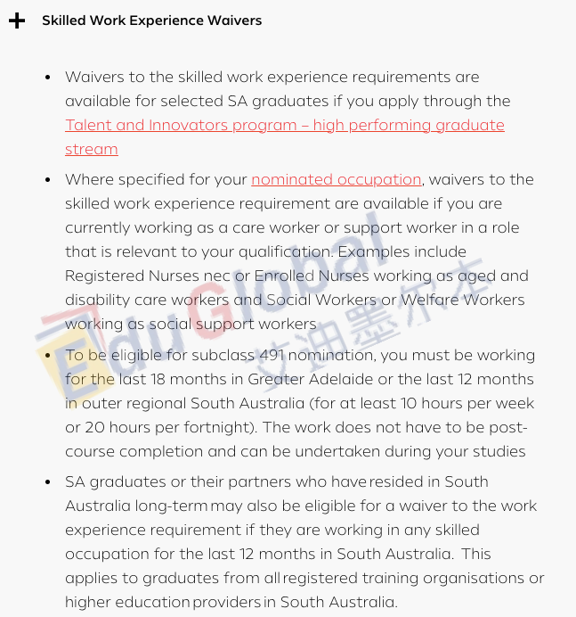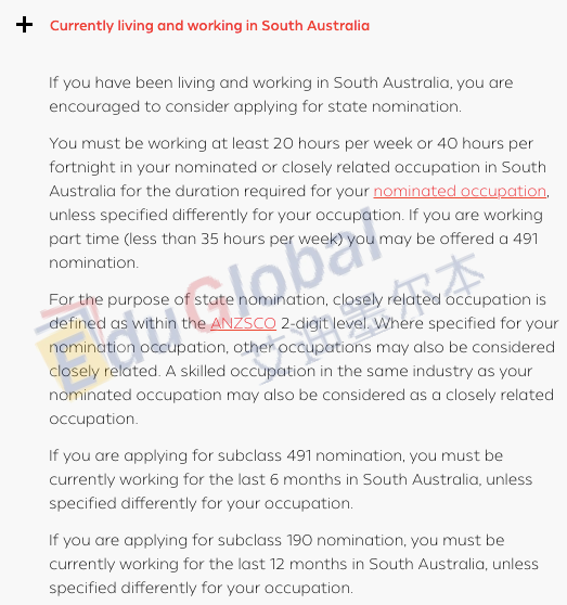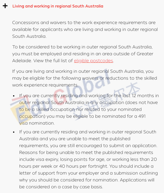 如果同学们在过去18个月在阿德莱德地区工作(无需与提名职业相关),或过去12个月在南澳远郊地区工作,且达到每周10小时/两周20小时,则无需毕业后工作经验即可申请491州担。