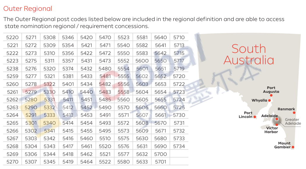 • 如果申请人过去12个月在南澳远郊地区(见下图)生活、工作(每周20小时或两周40小时),则可以任何职业申请491州担