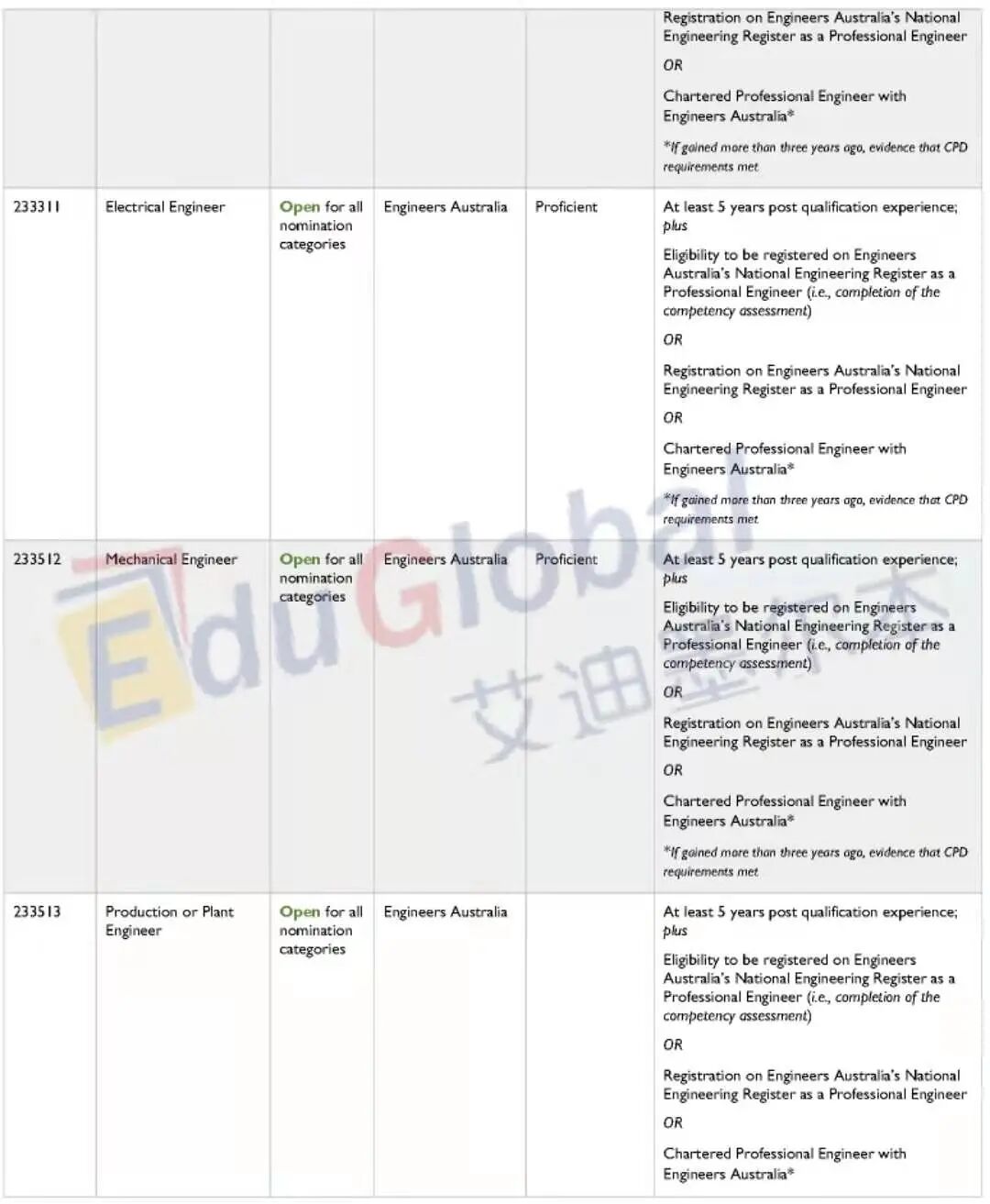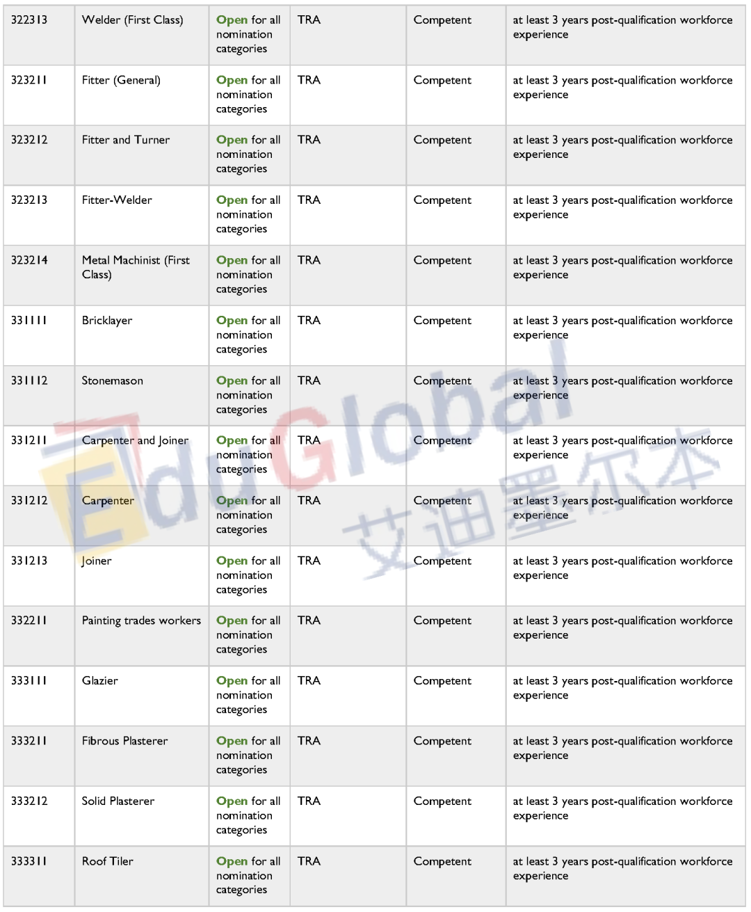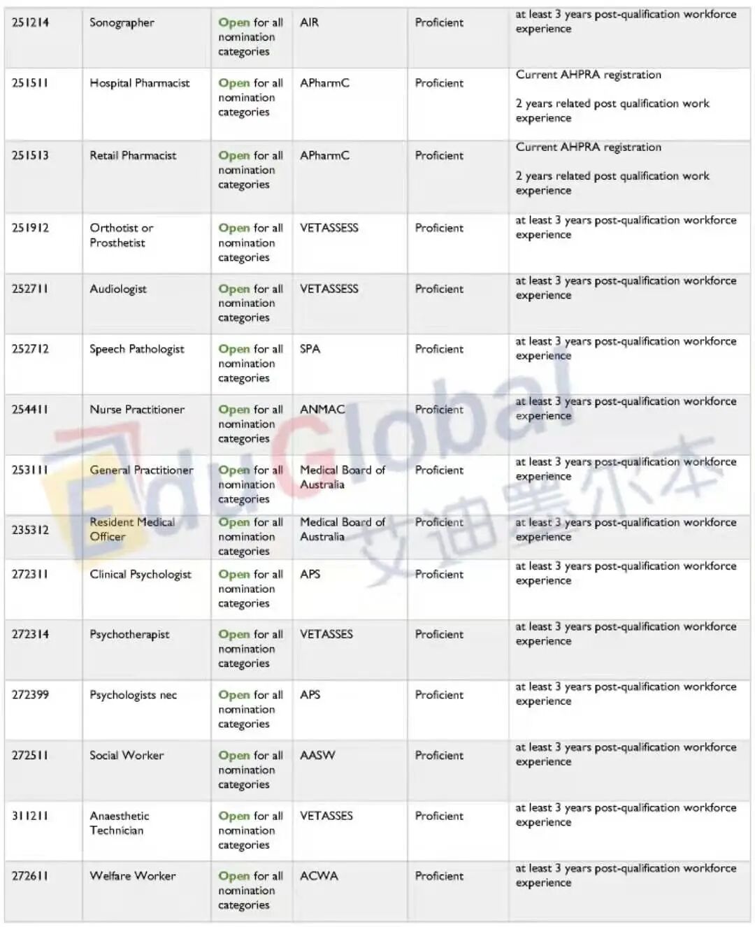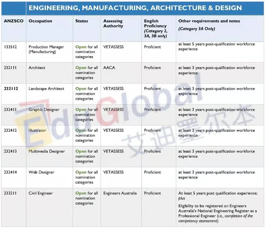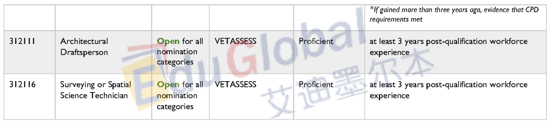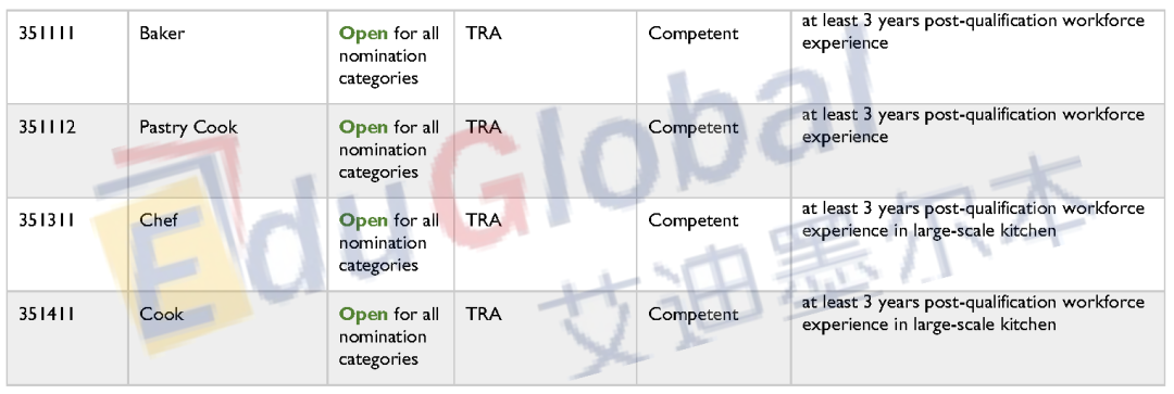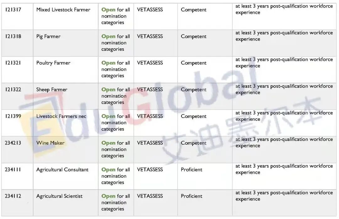 下面就是完整的职业清单了,大家可点击原文链接访问塔州政府网站。大家在寻找自己的提名职业是否在职业清单上的同时,境内190申请人也需要满足提名职业的英语水平(Competent = 雅思各科6分;Proficient = 雅思各科7分);境外无job offer申请人还需满足最右栏的工作经验要求(当前暂不涉及)。