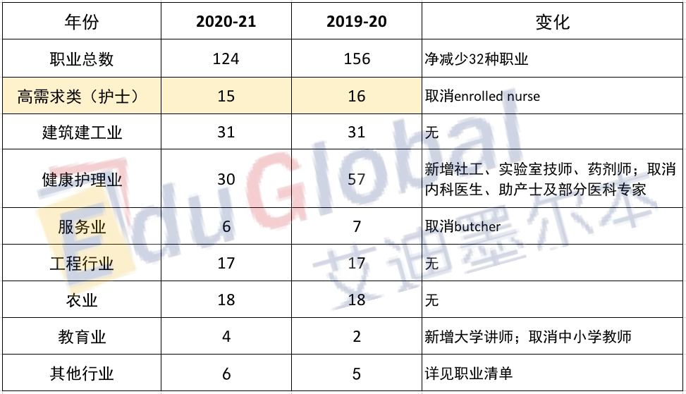 上表是职业清单中各领域职业数量相比去年的变化,其中受影响较大的则非医护和教育行业莫属了。在疫情后最受欢迎的医疗、护理行业中,几乎所有类别的注册护士以及理疗师、职业治疗师都被归位了“高需求职业”,即境内外申请人如满足英语、注册要求,即无需证明自己的岗位确实为市场所需。