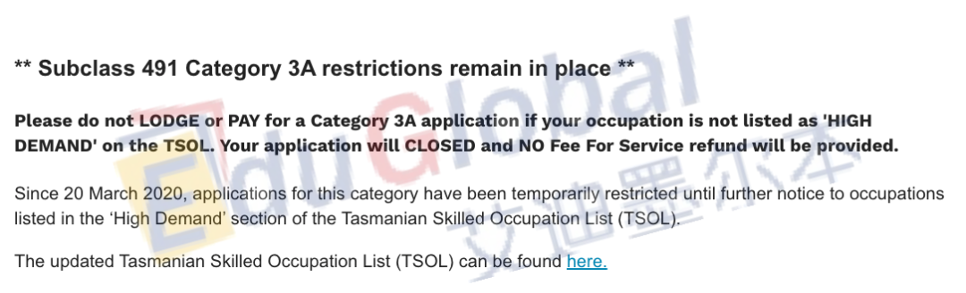 注:受到澳洲国境关闭以来的限制,目前3A类海外申请人的职业必须满足“高需求职业”(即注册护士和职业理疗师)才可能获批塔州州担;如果你的职业不满足此要求,请暂时不要递交州担申请。而塔州毕业生、在塔州工作的491申请人以及在塔州有直系亲属的申请人,则无需参考职业清单,可直接申请州担。