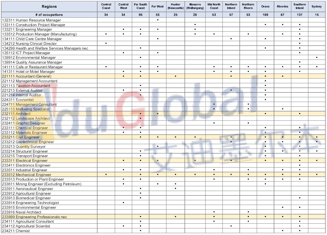 经过调整后,全州一共担保161个职业。在Hunter(Newcastle)等地区中,会计、土木工程、IT、教育、社工、厨师、汽修、木工等传统移民职业都回到了职业清单上;同时护理专业也遍地开花。