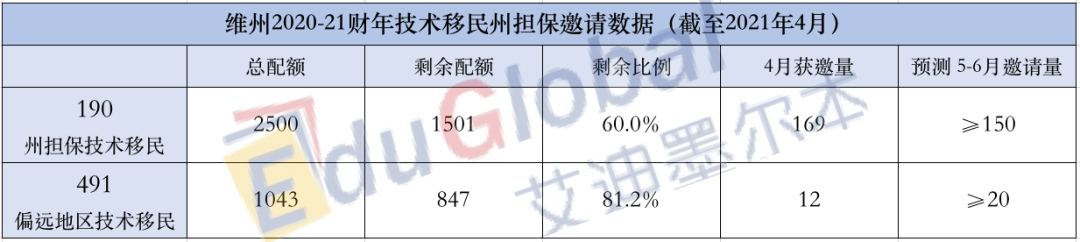 三月,维州共发放了169个190州担保和12个491州担保。截至4月30日,维州还剩余1501个190名额(60%)和847个491名额(81.2%)。