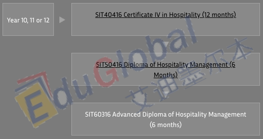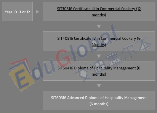 课程建议:如下图,同学们在高中毕业后,首先就读1-1.5年的专业四级证书(Certificate IV)课程,可选管理、烹饪或糕点师专业;而后再用一年时间就读服务业文凭和高级文凭(各6个月)。由于课程的实际操作性强,同学们必须在西澳境内。
