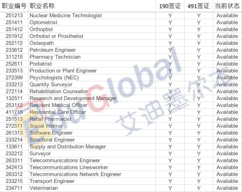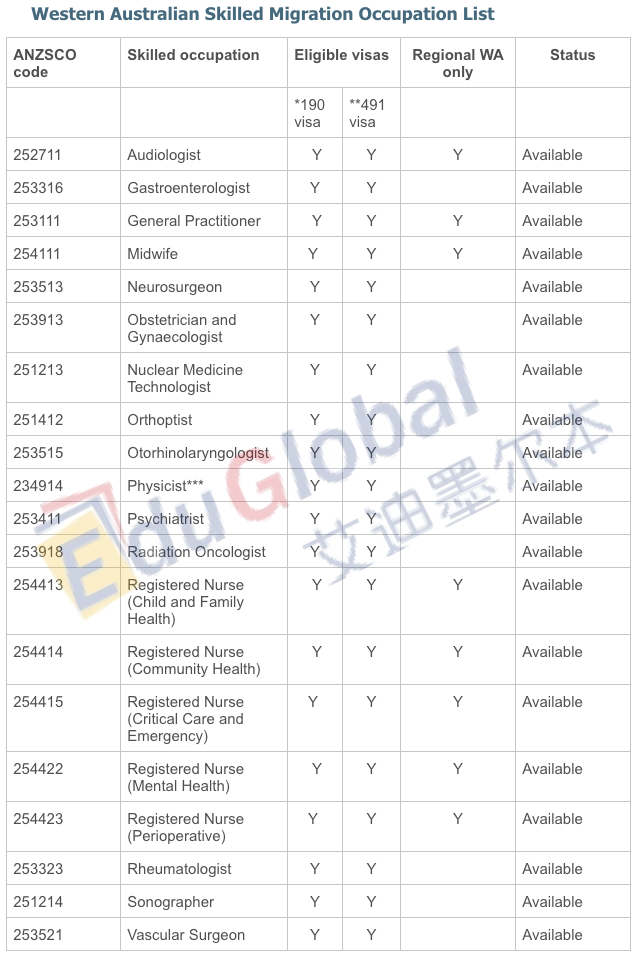 注:Hospital Pharmacist(医院药剂师)只适合非珀斯地区申请人申请,邮编为6041-6044, 6084, 6207, 6213, 6215-6537, 6560-6770。