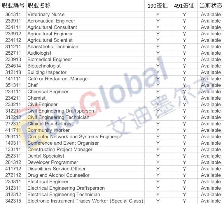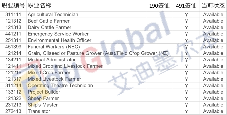 注:“Regional WA only”一栏中为“Y”的职业只适合非珀斯地区申请人申请,邮编为6041-6044, 6084, 6207, 6213, 6215-6537, 6560-6770。