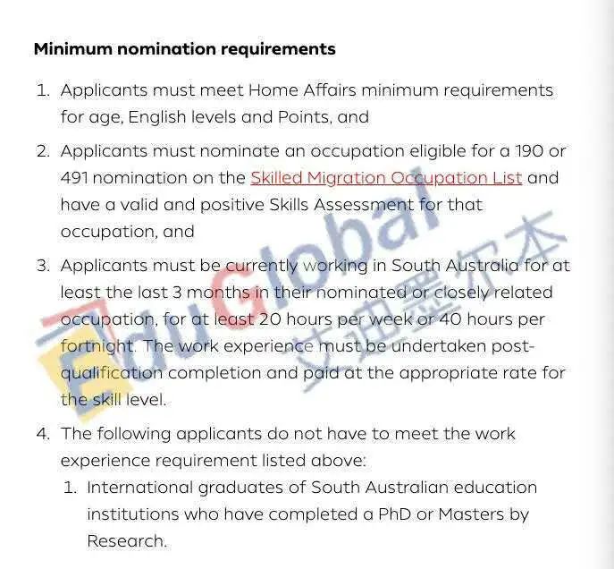 3. 申请人过去3个月内在南澳、提名职业高度相关的职业上工作,每周至少工作20小时。获得雅思7.5分、高分 (high performing) 和在南澳长期定居的毕业生有可能豁免该要求(详见下文)