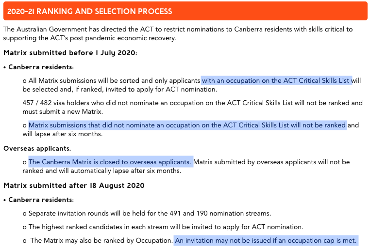 3. 州政府将关闭新财年州担的海外申请人通道,这意味着即使在上一财年已经递交Matrix的海外申请人,也将无法在新财年获得ACT政府的邀请。