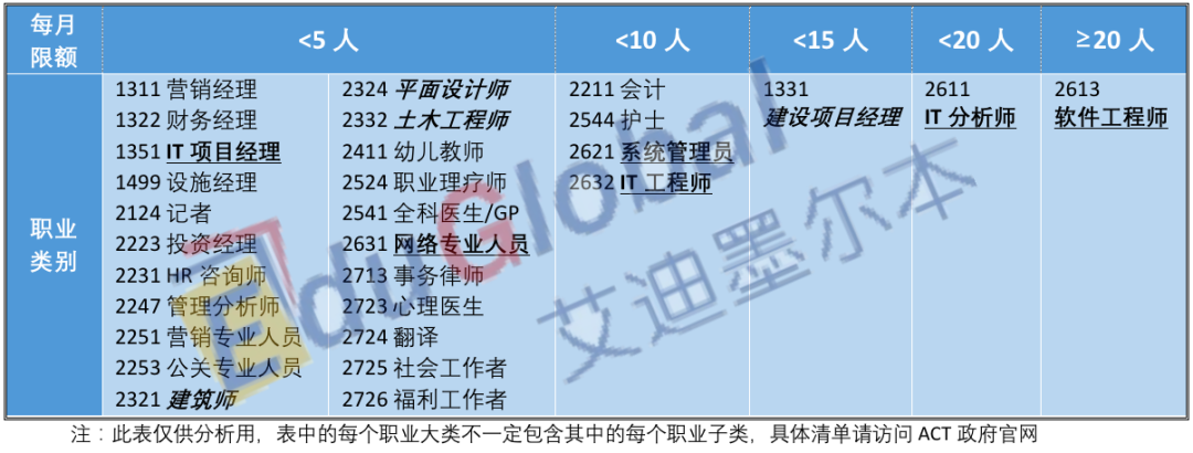 上图简要总结了ACT关键技术职业清单中各职业的人数上限,可见每月限额人数较多的职业主要集中在IT、土木工程等专业中;经理、会计医护人员和教育人员则占据了其他的名额。如需获取完整清单请访问: