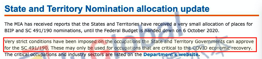 根据澳洲移民协会(MIA)发布的信息,各州政府在提名职业方面的限制也十分严格:不仅获得190、491邀请的人数少之又少,而且这其中大多数申请人的提名职业也属于COVID-19关键行业
