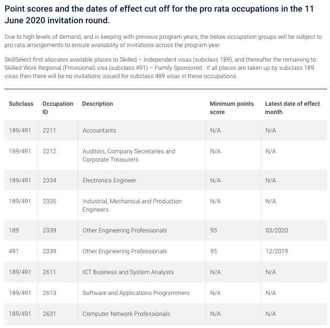 以今年6月的EOI官报(上一财年最后一轮)为例(如下图),往年十分红火的热门职业中,除了“其他类工程师”外,竟然一个邀请也没有发放;而冷门职业中却有200人获邀,且出现了189签证85分、491签证70分获邀的记录。
