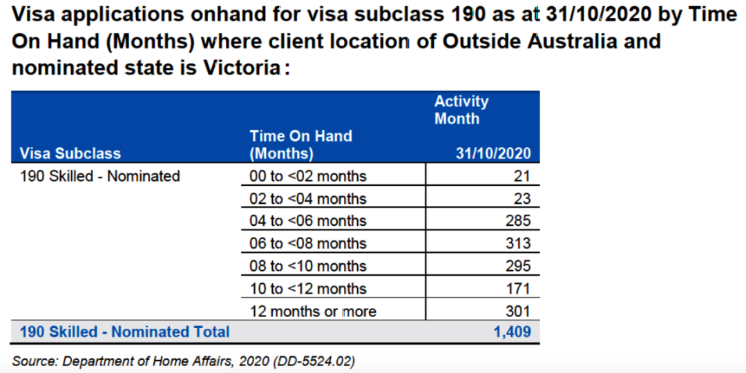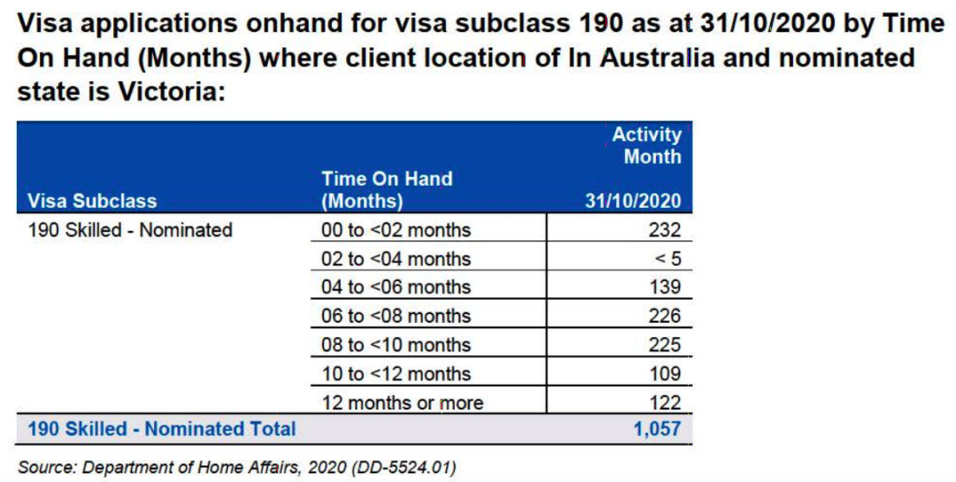 可见,在8-10个月和10-12个月这两档之间,积压申请人数量出现了断崖式的下跌。因此,绝大多数人的申请,应在递交后10个月内就会被审理完毕,这与澳洲的平均值(75% – 10个月)相吻合。不过,需要注意的是,在往常的许多维州190签证申请案例中,如果申请人的职业是护士,则通常在不到5个月,甚至1-2个月后就能下签。