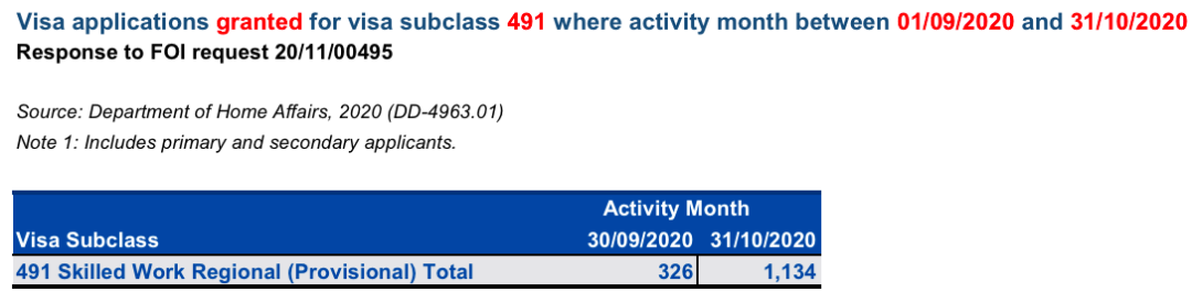 此外,移民局还报道了其9月和10月所审批的491签证人数(如下表,包括主副申请人):分别为326和1134人。减去移民局invitation rounds中公布的家庭类491移民数量(9月为150个签证,10月为80个签证),可见在10月,移民局仍然批准了约1000个州担保类491签证申请人。