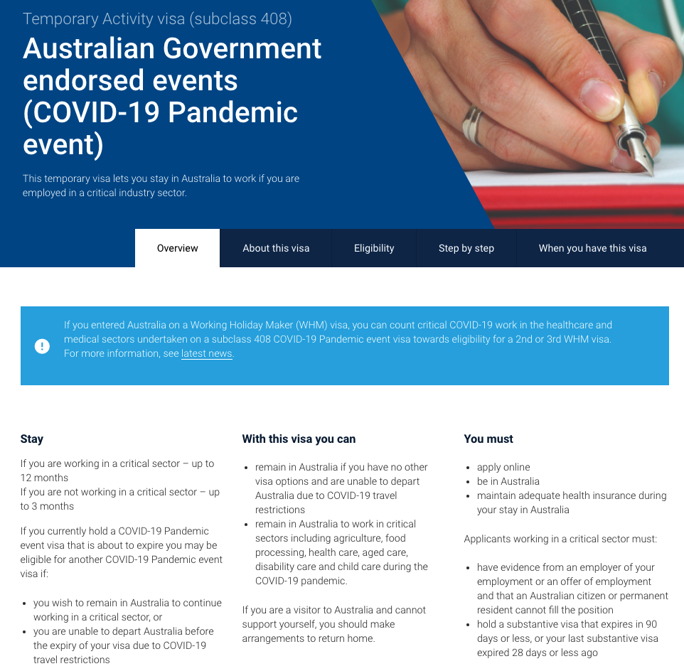 408(疫情期间临时活动)签证是移民局在去年疫情后,专为关键行业从业者所提供的一条继续在澳洲工作的捷径。该签证的申请人需满足: