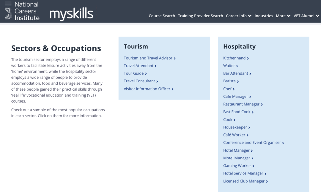 根据澳洲政府网站myskills对该行业的定义,有超过20类职业都属于“旅游和服务业”的范畴,具体包括:旅游业:旅行顾问、旅行社中介、导游、空乘人员、景点及问讯处服务人员等