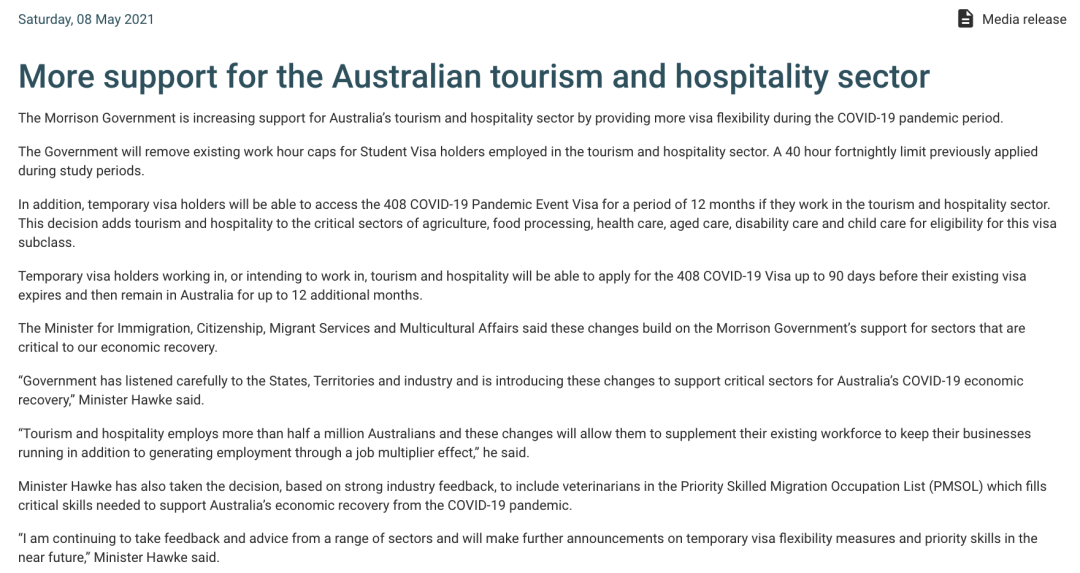 根据今天的新闻发布,已经或准备从事旅游和服务业工作的临时签证持有人(包括学生、毕业生、临时工作签证、打工度假签证),在签证过期的90天以内也将能申请408(疫情期间临时活动)签证。如果申请人获签该签证,则最多能在澳洲继续工作12个月。