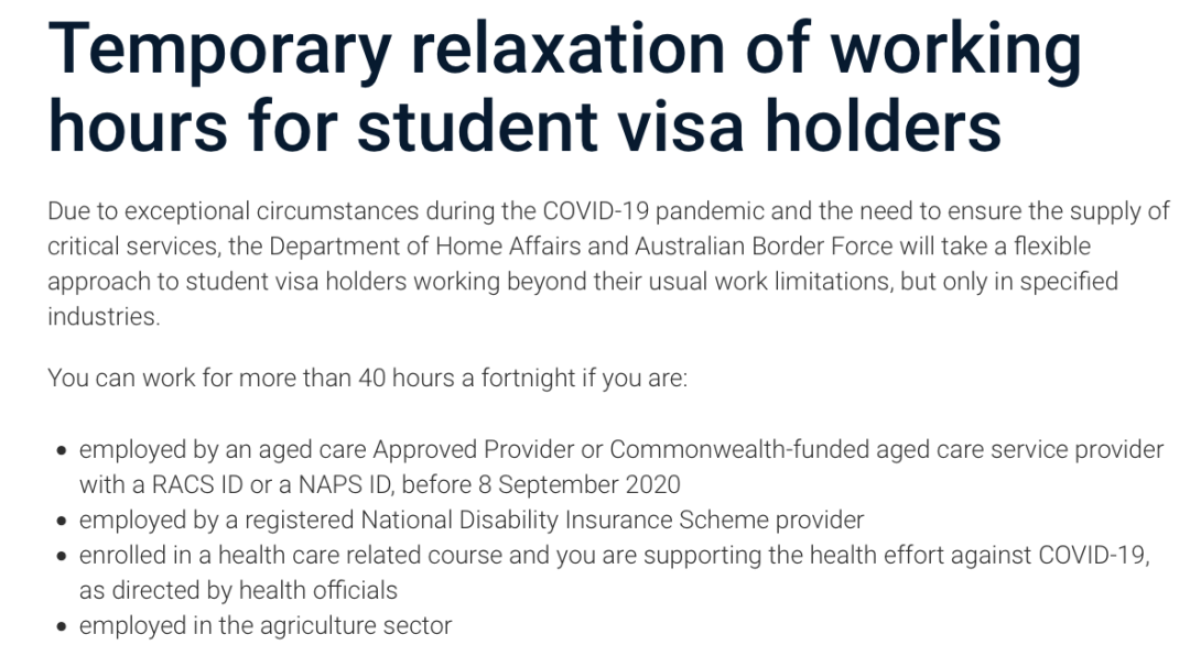 那么,除了旅游服务业之外,还有哪些行业的留学生不受工作时间的限制呢?原来,自从去年疫情发生以来,移民局就陆续放松了几个“关键行业”的学生签证工作时间限制。加上此次的变化,现在一共有这几个行业的留学生可不限时勤工俭学: