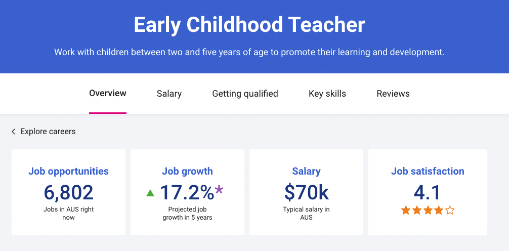 目前澳大利亚共有6802个职位空缺,未来五年会有17.2%的增长,年薪在7万澳币以上。虽然年薪不算很高,但是幼儿园老师一年里有四个假期还是很香的。那下面小艾就为大家讲解一下如何在幼儿园就业。幼儿园行业一般有以下三个职位: