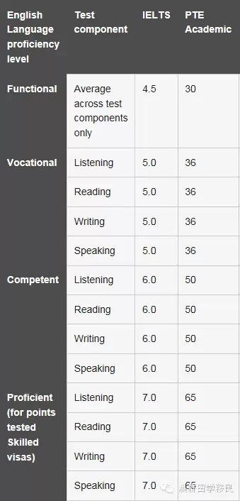 考试对象是打算出国留学的非英语为母语的考生。如你需要英语语言成绩向海外院校证明自己学术英语水平,则在传统考试之外,现在你有了新的选择。PTE学术英语考试能够准确地评估每个考生的听,说,读,写等语言技能,且基于真实学术语境,让你更快熟悉国外的学习环境。现在澳洲的大部分签证、移民及职业评估都开始接受培生的成绩,具体分数见下图。