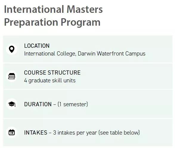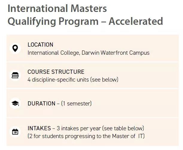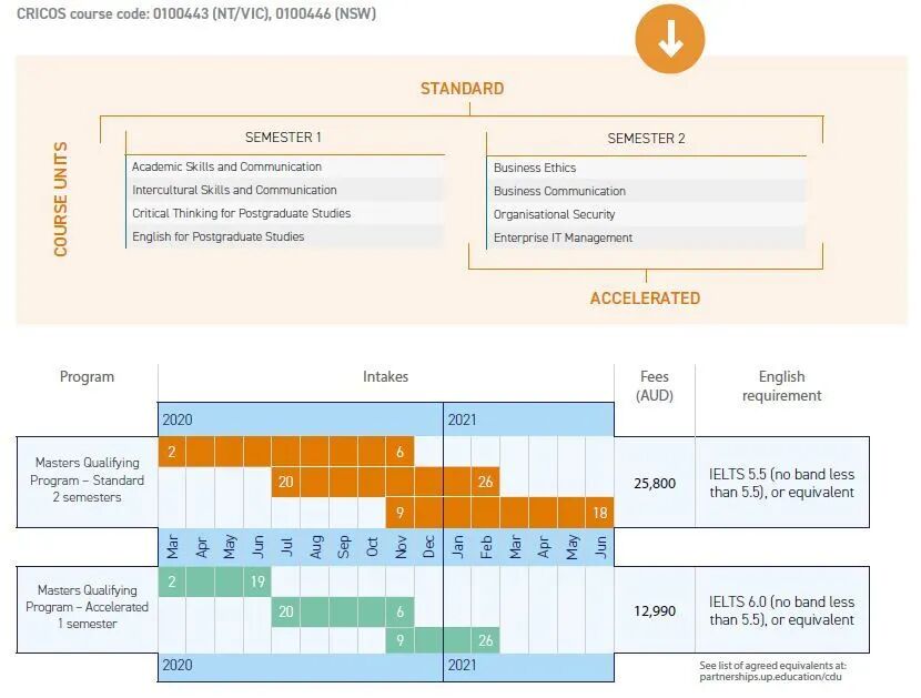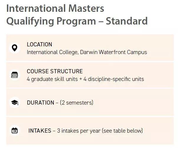 这所大学最与众不同的一点就是,同学们可以在大专毕业后,直接通过硕士预科课升入很多专业的硕士学习,与众多大学只允许本科毕业后才能上硕士的情况截然不同。好了,现在我们就来详细了解一下CDU的硕士预科课程:CDU提供三种硕士预科课程:;两种叫做Master Qualifying Program(MQP),分为标准课程(两学期)和加速课程(一学期);另外一种叫做Master Preparation Program(MPP)。