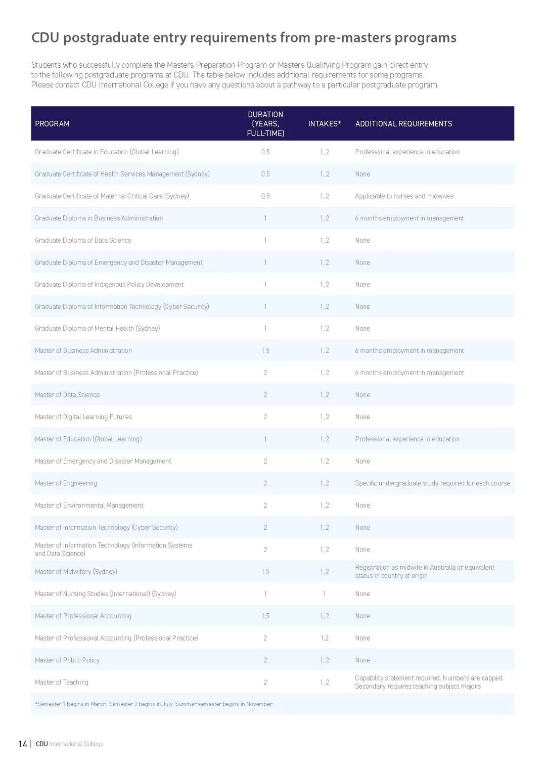 大家最好奇的,莫非是这些预科班可以衔接哪些硕士课程吧!答案是,非常多!当前CDU有9种研究生文凭(Graduate Diploma/Certificate)和16种硕士课程均支持预科直升,部分课程在悉尼校区上课,详情见下图: