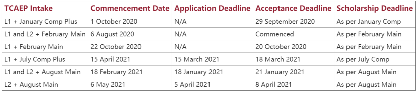 也就是说2021年1月开学的预科强化课程/强化延长课程,奖学金的申请截止日期将在2020年10月9号。2021年2月开学的预科标准课程,奖学金的申请截止日期为2020年11月6号。2021年7月开学的预科快捷课程,奖学金的申请截止日期为2021年3月12号。2021年7月开学的预科强化/强化延长课程,奖学金的申请截止日期为2021年4月9号。2021年8月开学的预科标准课程,奖学金的申请截止日期为2021年4月30号。2021年10月开学的预科快捷课程,奖学金的申请截止日期为2021年6月18号。