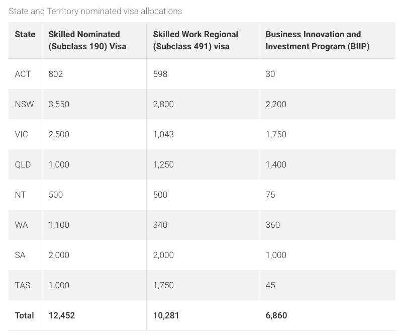 加上今年早期移民局为ACT(堪培拉)增加的100个190配额,移民局在去年10月预算公布后,一共为州担保移民项目加注了1300个名额。读者们若有兴趣查看详细的配额数量对比,可查看下表: