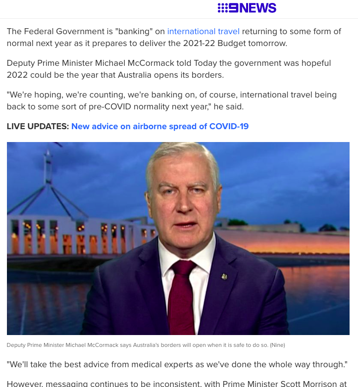 而在近两日,根据多方媒体报道,此次的联邦预算案是建立在“2022年初澳洲边境开放”这一设想上的!