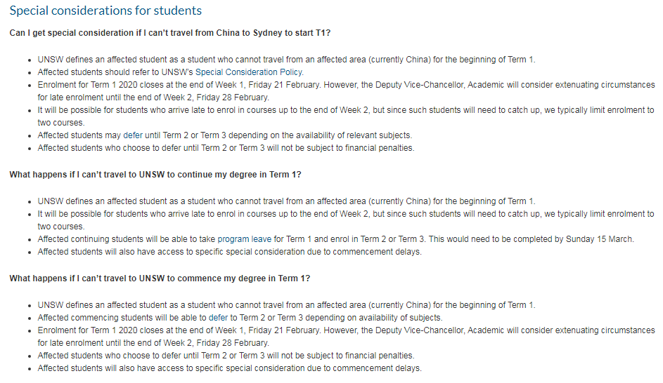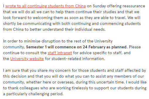悉尼大学当前也给所有来自中国的同学发送了邮件,询问每位同学的情况和可能需要的帮助服务;并表示同学们可以在开学两星期内(3月9日前)入学;不过悉尼大学并未采取延期开学措施。