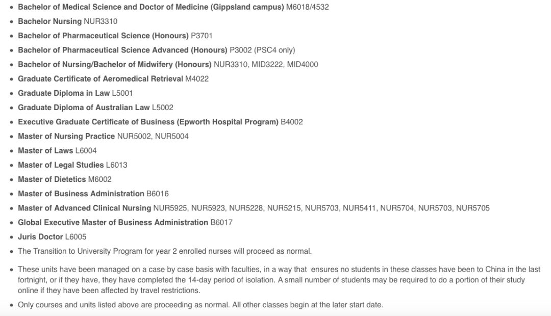 上学期预科课程已于1月27日开学,因此绝大多数同学并未受影响;上学期本科快捷课程(Diploma)将于2月24日开学,因此同学们应在2月10日前抵达墨尔本;如果无法按时入学,可申请延期入学,最晚至3月9日。
