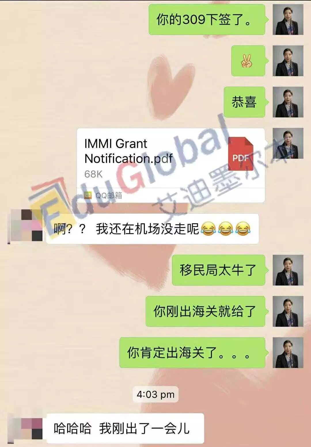 Mary终于到达机场出港大厅了,她开心地扫描完护照,离开澳大利亚海关。刚一出关,只听见她的微信突然收到了很多消息,再一看,竟然是小艾发来的:祝贺您,您的309签证已经下签了!