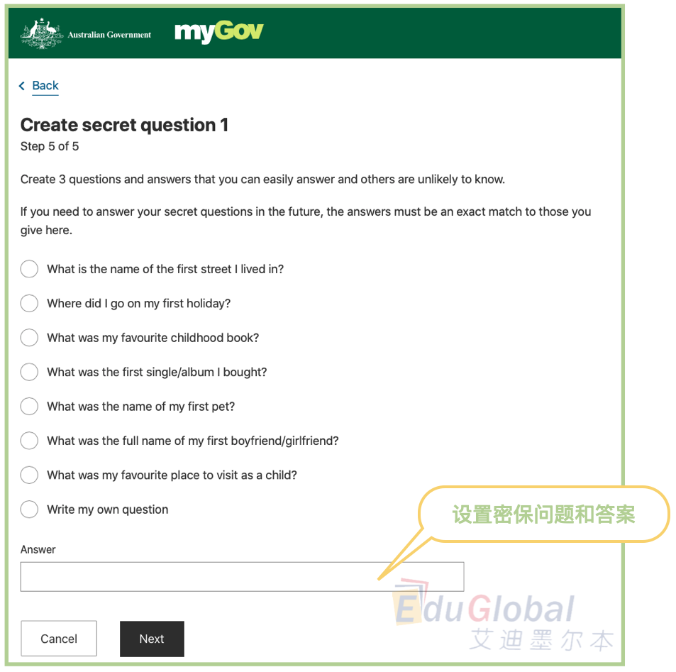 5. 创建密码并填写安全问题。