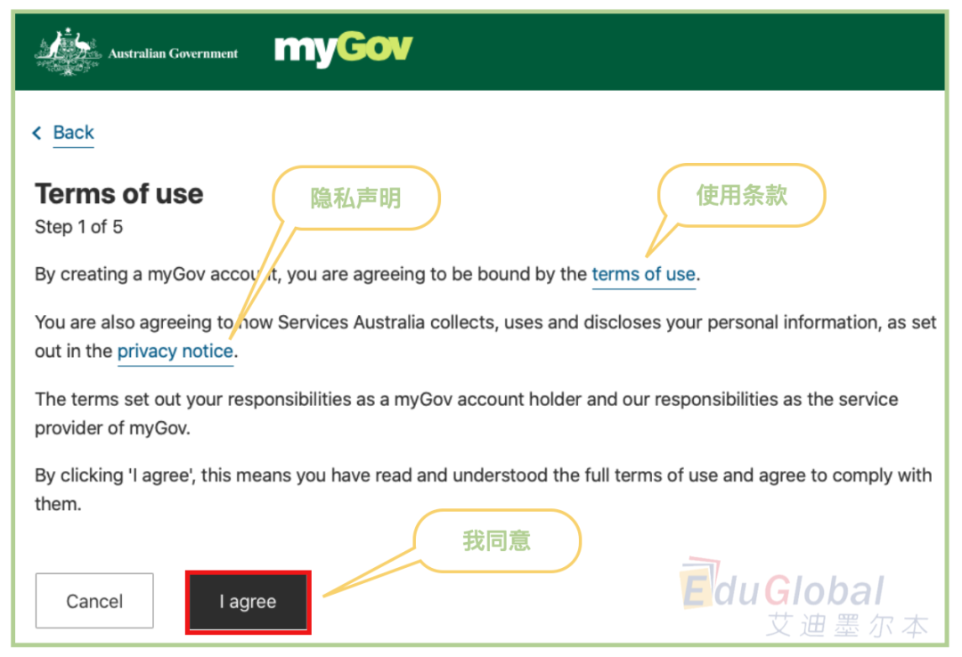 2.阅读《使用条款》和《隐私声明》,选择I agree。