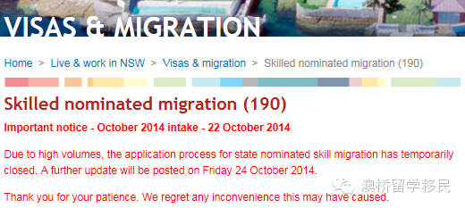 亲爱的小伙伴们,昨天新州州担保的申请又刷爆了。所以善解人意的州政府officer们暂时关闭了申请通道,新的消息敬请关注10月24日新州的通知。 详情见下图,未完待续…… 澳桥原创,转载请注明出处! (图片来自新州网站)