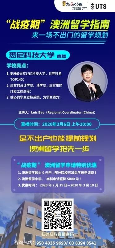 澳洲排名第一的新兴大学,护理全球第十、艺术、设计、运动学全球前50的悉尼科技大学预科、文凭课程申请、特色课程推荐;如何高二毕业就能轻松进入QUT?直播时间:2020年3月6日 上午10:00