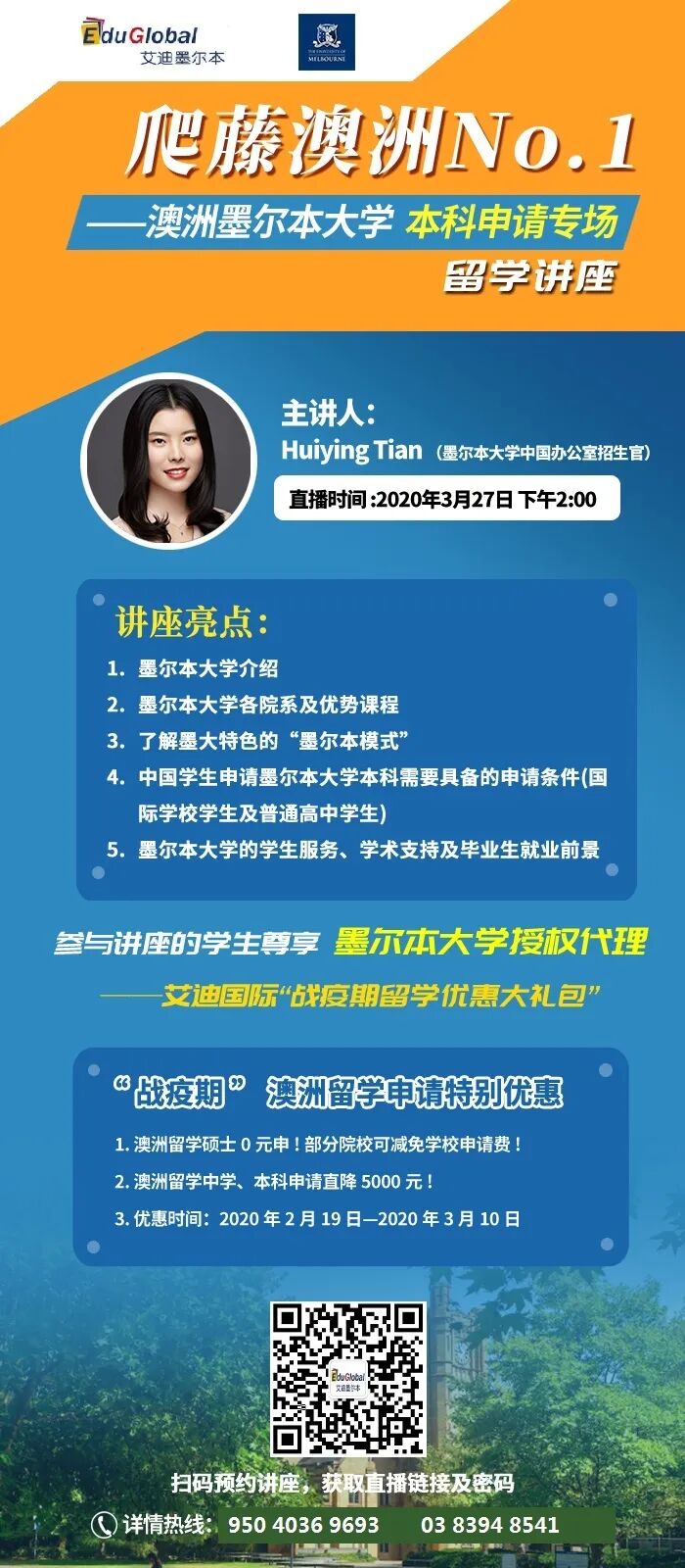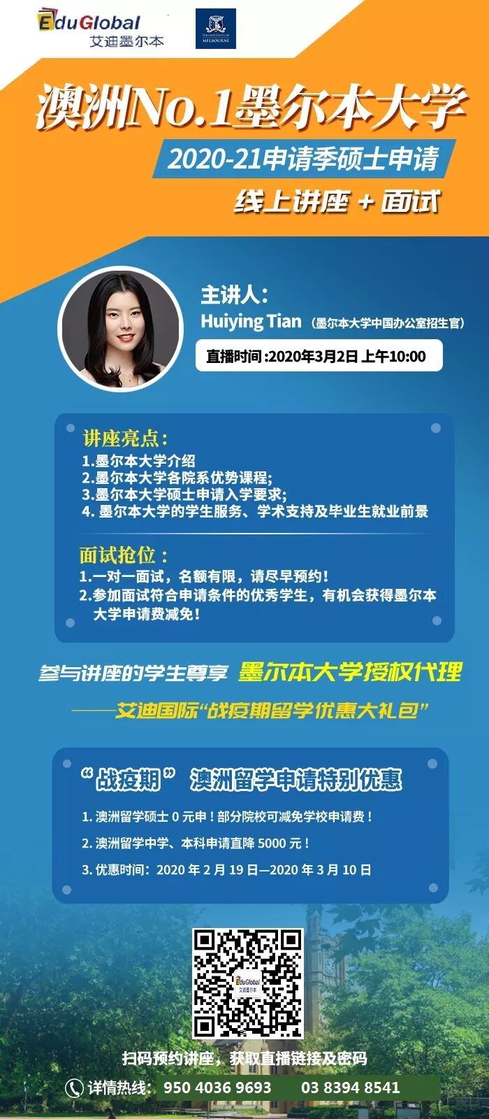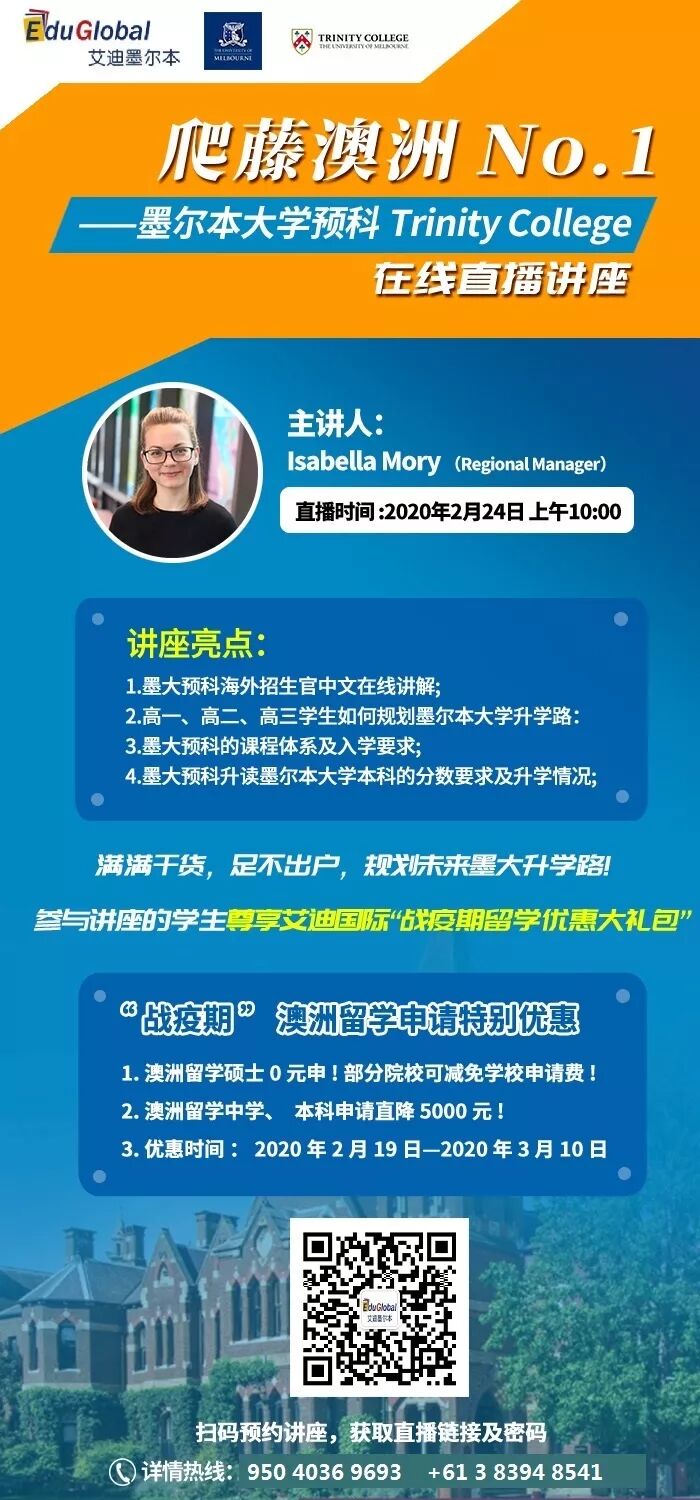 作为墨尔本乃至全澳最优秀的大学,不妨了解一下墨尔本大学有哪些值得一看的热门专业,同学们又如何能通过其预科班Trinity College/圣三一学院成功升入墨尔本大学呢?直播时间:2月24日(圣三一学院);3月2日、27日(墨尔本大学)