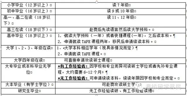 自2014年3月起,小学毕业的学生即可申请赴澳大利亚读书,所以最小年龄为小学毕业,最大年龄可以到40岁。下面是对于申请人学历的赴澳就读分类表: