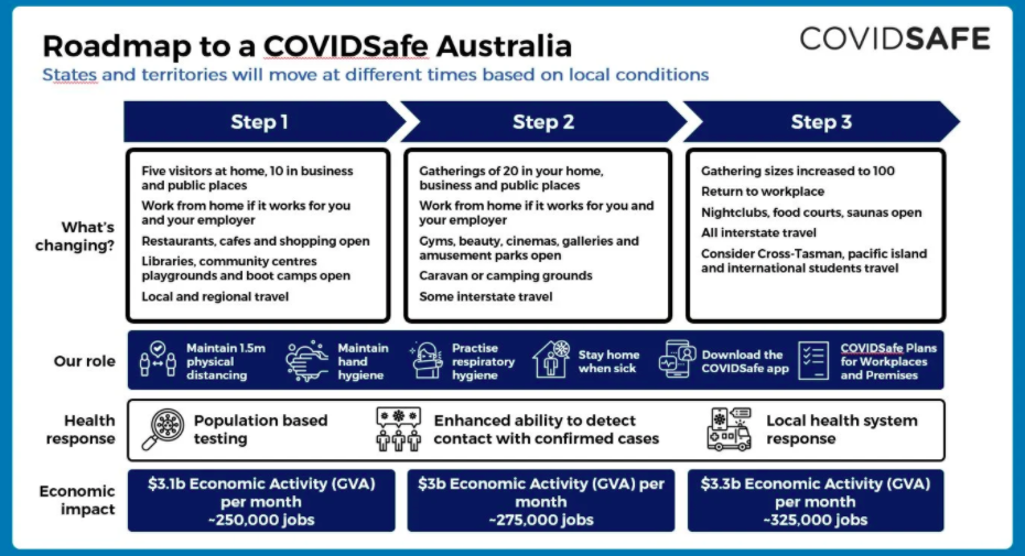 最后,小艾要祝贺澳洲“抗疫”在今天取得的初步胜利,希望在不久的将来,包括签证审理的一切都能尽快恢复正常!大家周末愉快!以下是今天澳洲政府公布的COVID-19“三段式”恢复计划,有兴趣的童鞋们可以看看什么时候可以恢复旅游、运动和BBQ了哦!