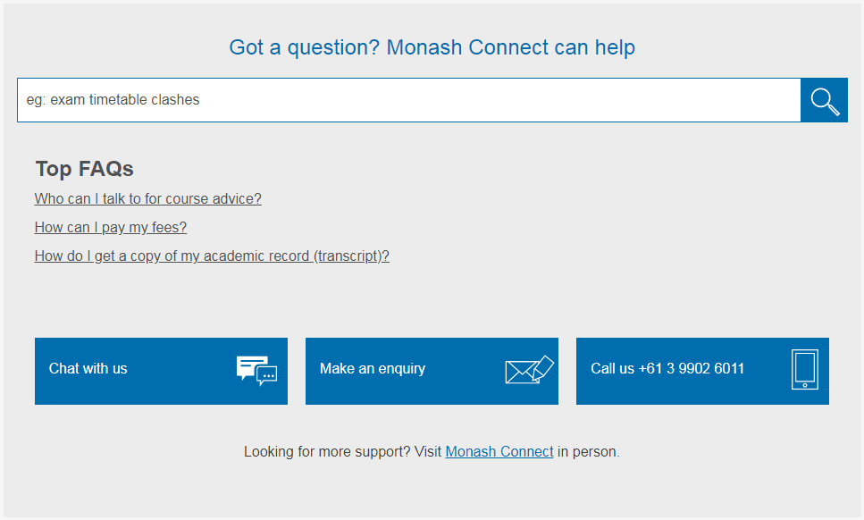 如果同学们有更多问题,可与Monash Connect 预约服务、通话或网上沟通