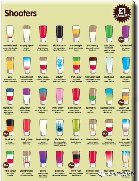 纯的不含饮料和冰块的酒(用小酒杯的”shot”.也有一些比较常见的shooter。