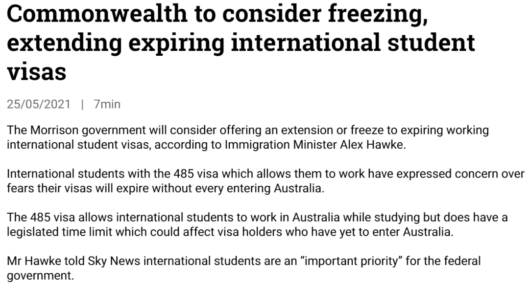 最近移民部部长Alex Hawke表示:澳洲联邦政府在考虑延长或者冻结即将结束的485工作签证!这也就意味着现在持有485工作签证的同学,无论人在境内还是境外都有机会延长签证时长。这样境内正在移民凑分的小伙伴也不用担心签证到期分数不够怎么办,而境外的同学也不用担心还有没有机会来澳洲刷简历了。