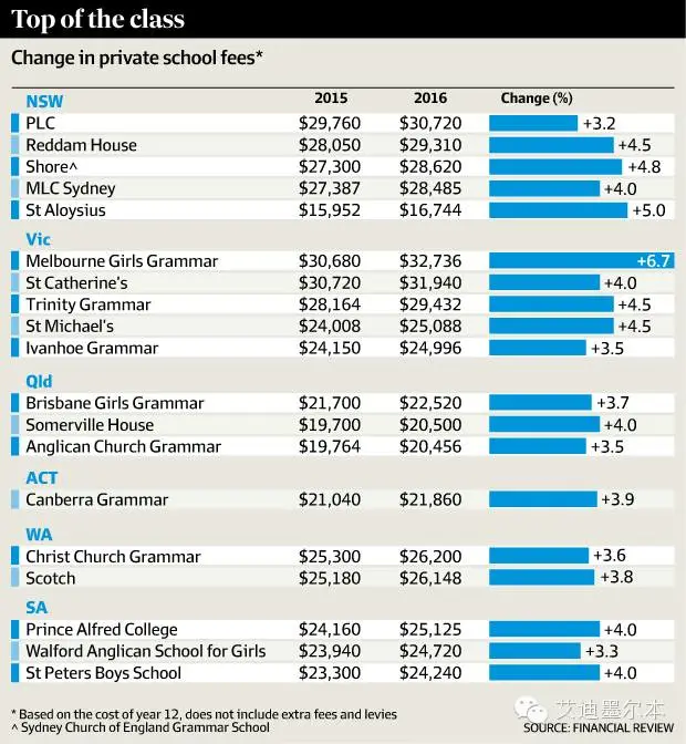 该报告指出,2015年全澳的私立中学平均每个学生每年的学费为19014澳元,新南威尔士州的平均学费为22280澳元,维多利亚州为21443澳元。