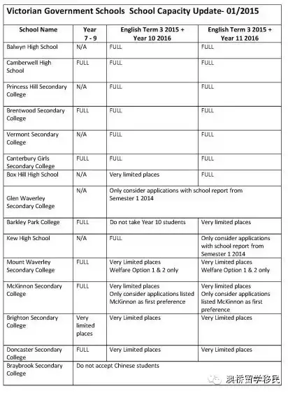 例如,维州公立中学早就在2015年1月份就宣布:2016年几大招收海外学生的公立中学招生名额已经基本全部爆满(见下图)。