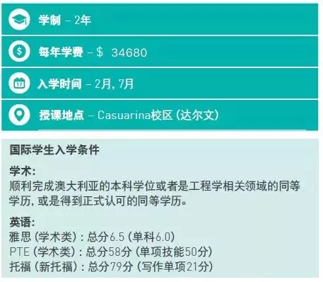 Master of Engineering (Civil and Structural, Electrical and Electronics, and Mechanical)都是EA (Engineer Australia)的认证课程,毕业后可顺利拿到Professional engineer的职业评估。同时,Master of Engineering还获得了欧洲工程教育认证体系(EUR-ACE)的认证,在全澳大利亚仅有查尔斯达尔文大学和墨尔本大学同时受到以上两项认证。