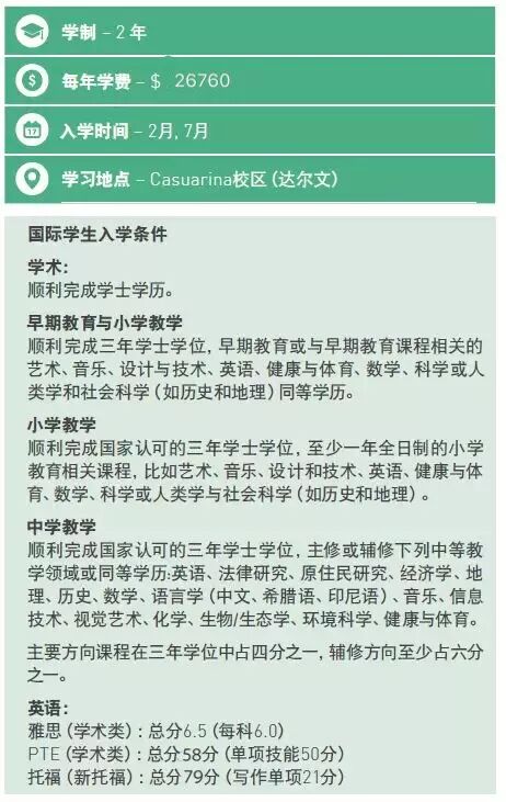 适用人群:该课程适合已经在澳洲读过2年硕士想移民的同学,接着去查尔斯达尔文大学读2年teaching硕士毕业,完成总共4年的学习,就可以直接申请AITSL的澳大利亚教师资格认证。