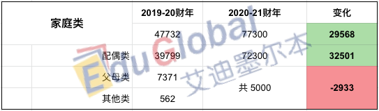 家庭类移民主要包括配偶类移民(820-801签证)和父母类移民(143等签证)。家庭类今年的移民配额总量增加了约60%,从47,732名增加到了77,300名。不过,实质上出现增加的则仅有配偶类移民一类;反之,父母类(以及其他类)则出现了较明显的下降。
