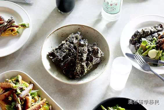 这座餐厅主要提供的菜肴是现代的澳大利亚菜,有格林韦尔猪肉、咖喱葡萄干、传家宝胡萝卜、干熏牛肉,配有葱环、油封蛋黄和干草灰。