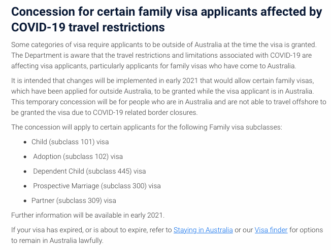 移民局于11月28日发布的“家庭类签证COVID-19利好政策”中,提到了将于2021年初免除部分家庭类移民签证的“申请人必须在境外等待审理”这一要求。受惠的签证类别包括309(境外申请的配偶移民签证)在内的5类签证[如下图],这意味着之前已申请过这几类签证的申请人,将无需专门离开澳洲,而可在澳洲境内等待签证下签。是不是更安全、更省时、更省钱了呢?