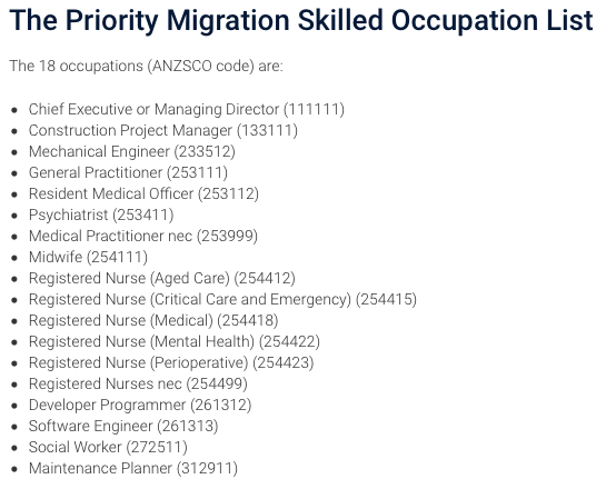 为了支持澳洲疫情后的经济和健康行业复苏,澳洲移民局于今年9月2日制定了一个“优先技术移民职业清单”。申请雇主担保技术移民时,如果申请人提名了该清单上的17个职业,则将被率先审理。虽然移民局称该清单只适用于雇主担保技术移民,不过从近几个月的独立、州担保技术移民邀请情况来看,在此清单上或与其类似的职业也大多会被优先考虑。